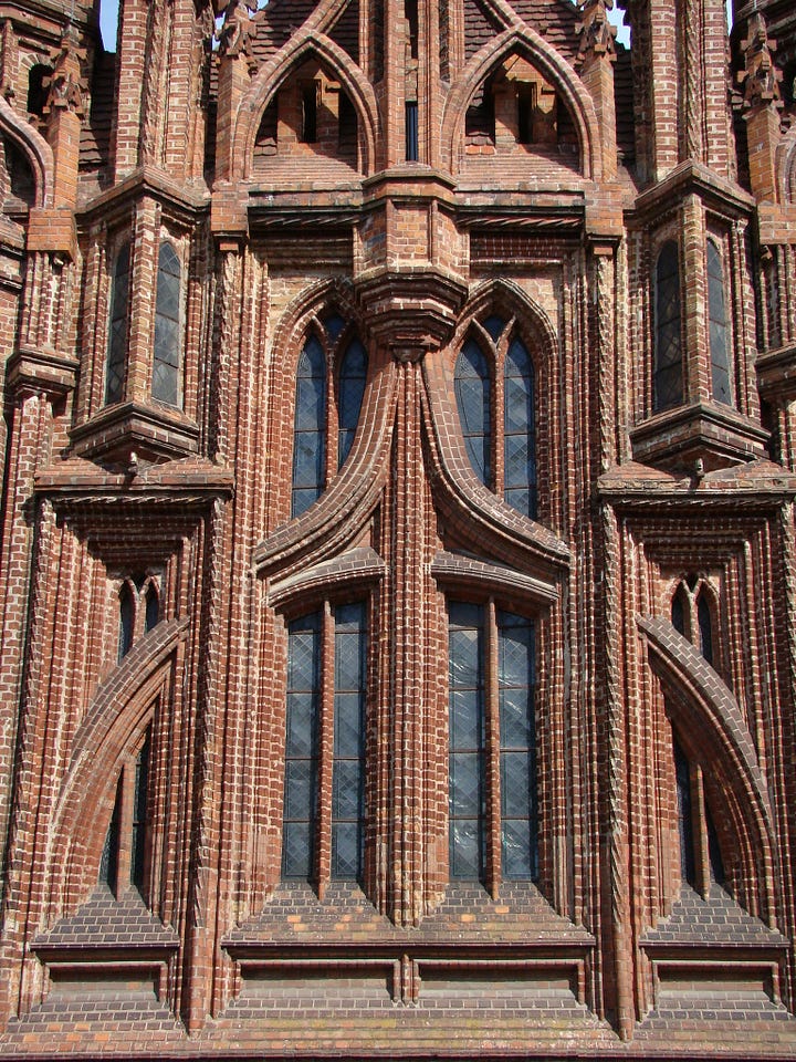 But St Anne’s is not wholly unique. It is, rather, a supreme example of an architectural style known as Brick Gothic. This was, as the name suggests, a subgenre of the Gothic Architecture which dominated Western, Southern, and Northern Europe from the 12th to the 16th centuries. And, as the name also suggests, its defining characteristic is that its prime material was bricks (rather than, as elsewhere, stone). St Mary’s Cathedral in Gdańsk, Poland, is a good example of Brick Gothic at its most monumental: